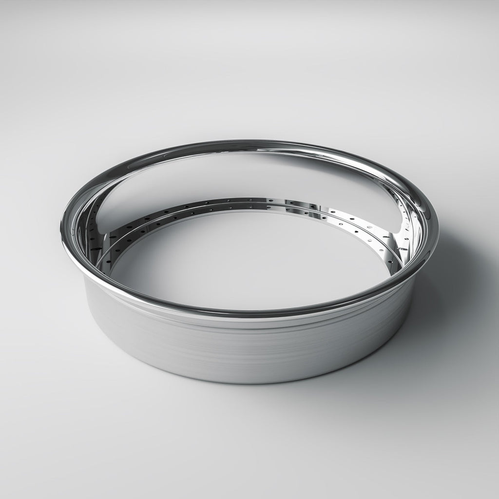 18” Diameter | M8 20 or 40 Bolt | Reverse (Flat) | Aluminium | Mirror Polished Finish | Rolled Outer Edge | Suitable for conversions on your two piece to three piece split rim wheels.*